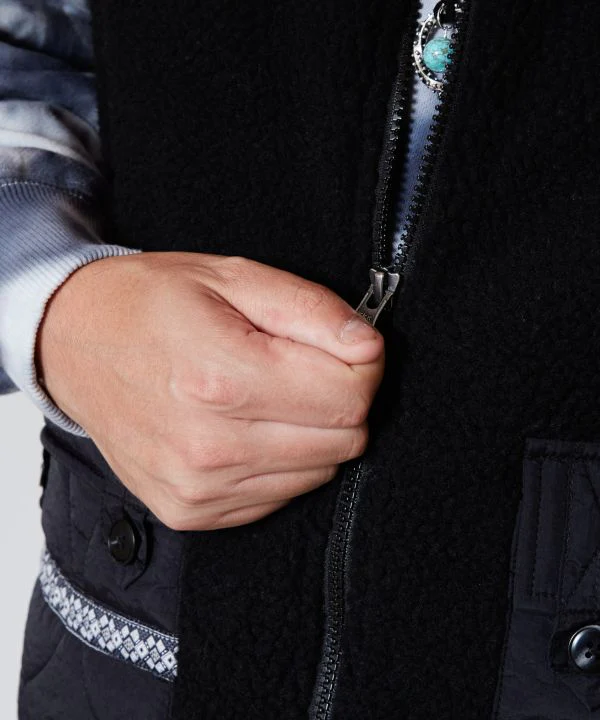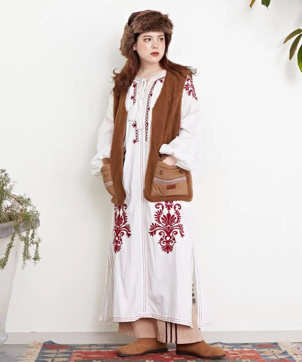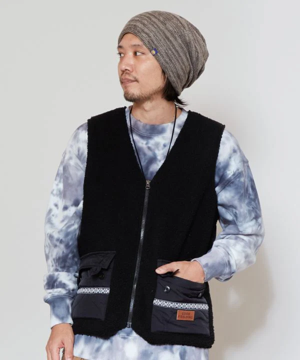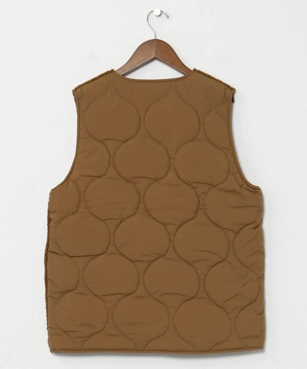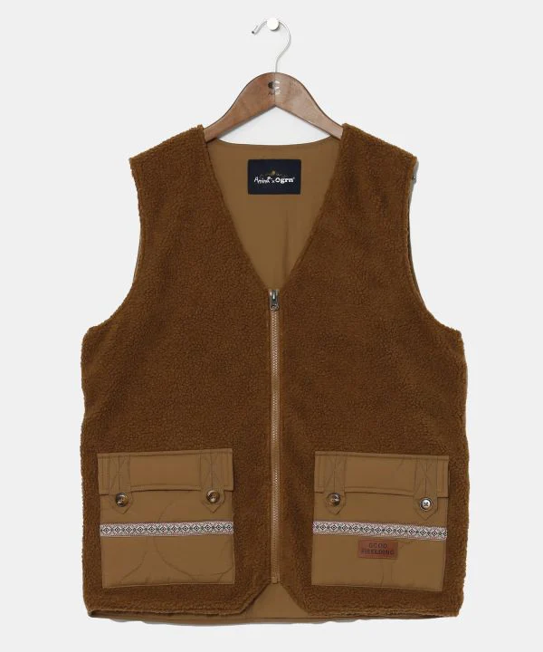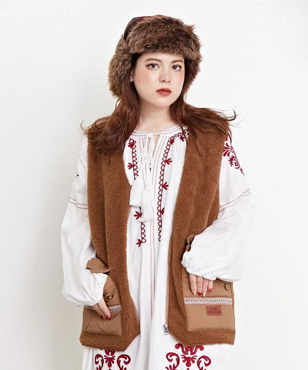 Amina Projet de collaboration x grn. Un gilet en matière boa avec un design matelassé en nylon brillant. Les grandes poches sont faciles à utiliser. Malgré la silhouette ample, le matériau est léger, ce qui le rend facile à utiliser comme vêtement d’extérieur léger pour les longues saisons.
