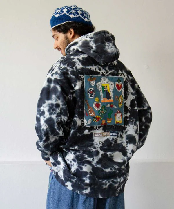 Amina Projet collaboratif x grn. Ce haut à capuche pour homme est confectionné dans un tissu résistant et doublé, orné d’un motif tie-dye original. Idéal pour les tenues décontractées. Au dos est imprimé le motif du « Jour des Morts » au Mexique. Il est écrit en espagnol : « Le Jour des Morts est un jour important pour célébrer le lien entre la vie et la mort. »