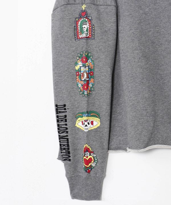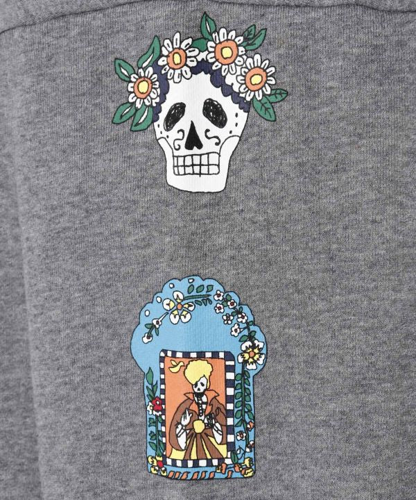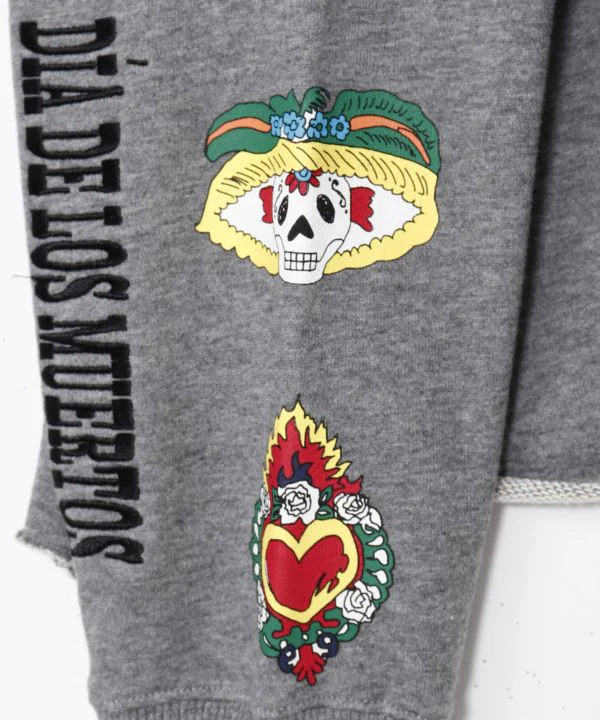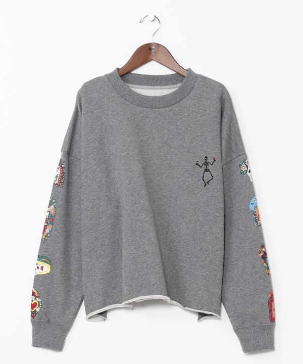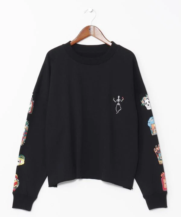 Amina Projet collaboratif x grn. Haut luxueux orné de broderies et d’imprimés, confectionné dans un tissu résistant et doublé. Sa matière extensible est agréable à porter. Son ourlet à l’allure rétro en fait un modèle idéal pour un usage quotidien. Les manches sont ornées d’une broderie représentant le Jour des Morts (Dia de os muertos) en espagnol et d’un imprimé de calaveras, inspiré d’une photographie exposée sur un autel.
