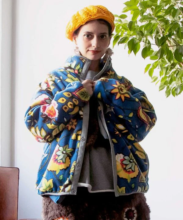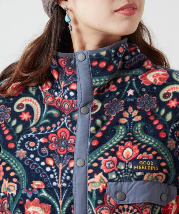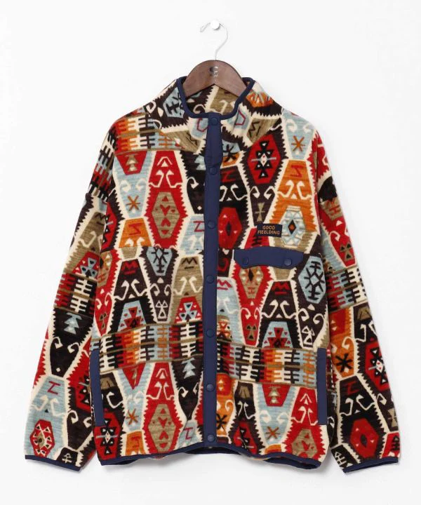 Amina Projet collaboratif x grn. Chaude et légère, cette veste polaire douce est idéale au quotidien. Une pièce fonctionnelle qui s’enfile et se retire facilement lors des périodes de fortes variations de température et des activités de plein air. Le motif s’inspire de la « Ceinture des Tapis », une zone de production de tapis sur la Route de la Soie, et son originalité est séduisante. Elle est dotée de poches sur la poitrine et sur les côtés.
