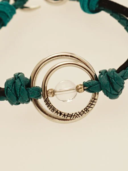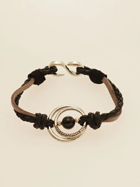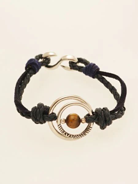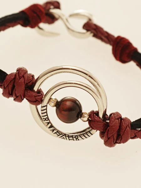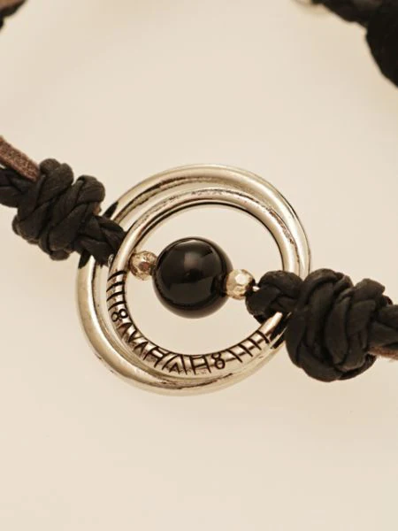 Ce bracelet s’inspire des planètes scintillantes. Il arbore un motif tribal gravé sur les pierres naturelles et l’anneau en métal.