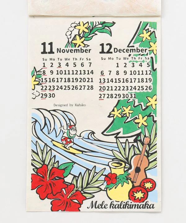 Ce calendrier présente des représentations colorées de divers monuments et événements hawaïens. Fabriqué à partir de matériaux écologiques, il est empreint de bienveillance et de respect pour l’environnement naturel hawaïen. Il comporte 6 pages. Les jours fériés sont inspirés des fêtes japonaises.