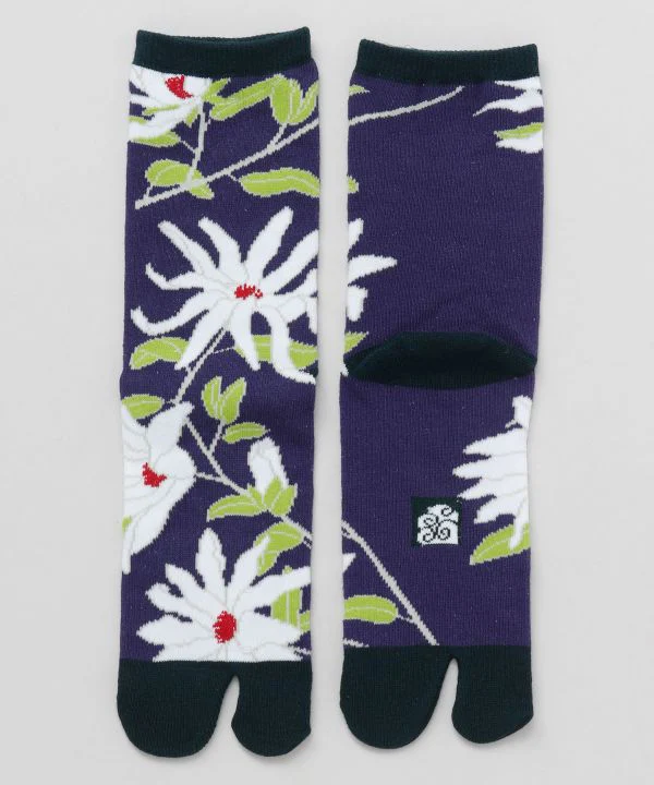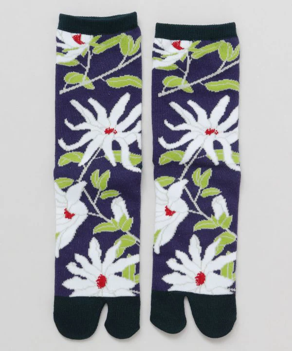 Chaussettes Tabi Shoes ornées de fleurs kobushi disposées avec audace. Le langage des fleurs est « l’amitié ».