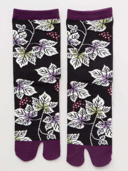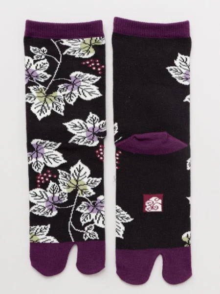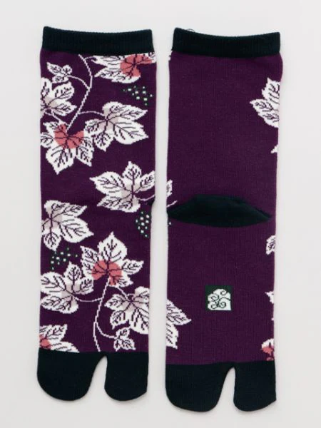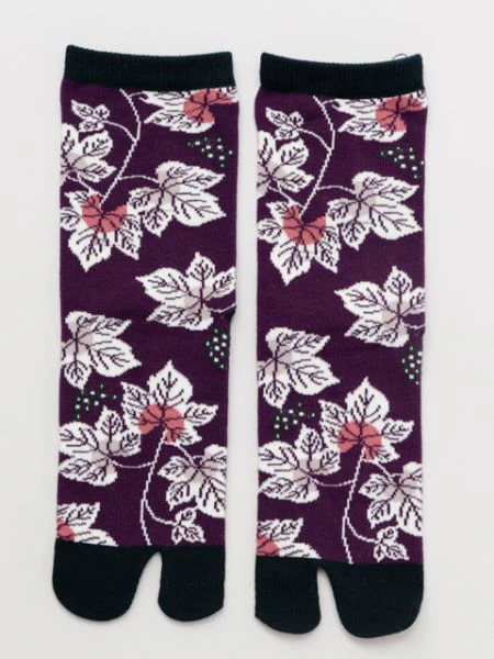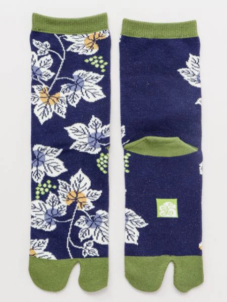 Chaussettes de type Tabi fabriquées dans la préfecture de Nara. Motif botanique apaisant repensé à partir d’un kimono avec des feuilles de vigne.
