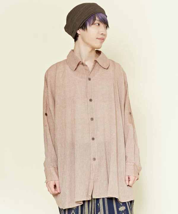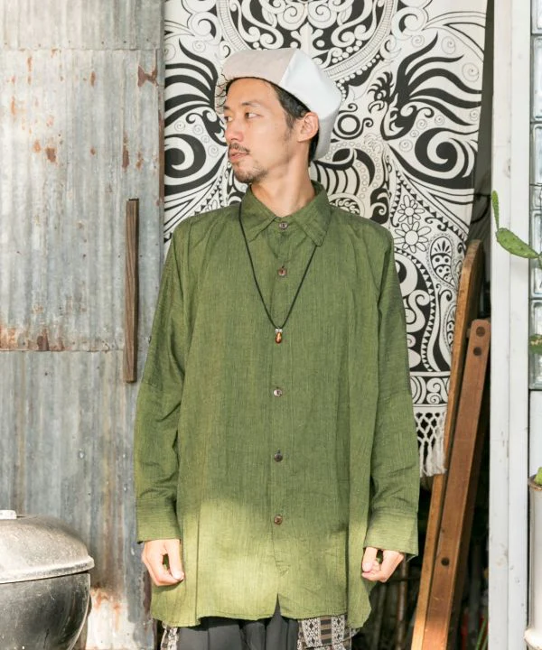 Profitez de la texture rustique. Vous pourrez profiter de la texture du coton népalais en portant cette chemise pour homme à grande silhouette. Elle est superbe non seulement comme chemise, mais aussi comme veste tissée. La longueur peut être ajustée grâce aux boutons sur les manches. Unisexe. Un article indispensable pour les longues saisons.