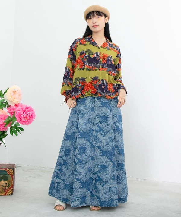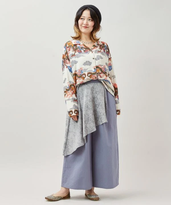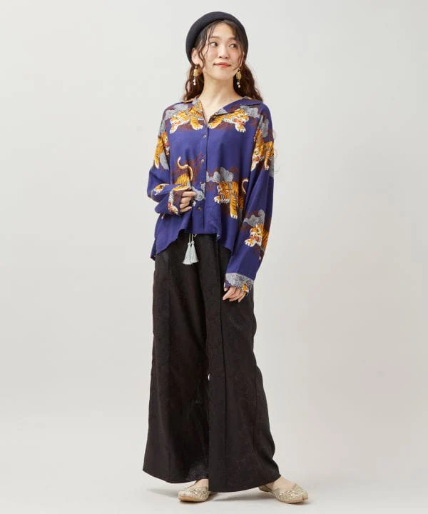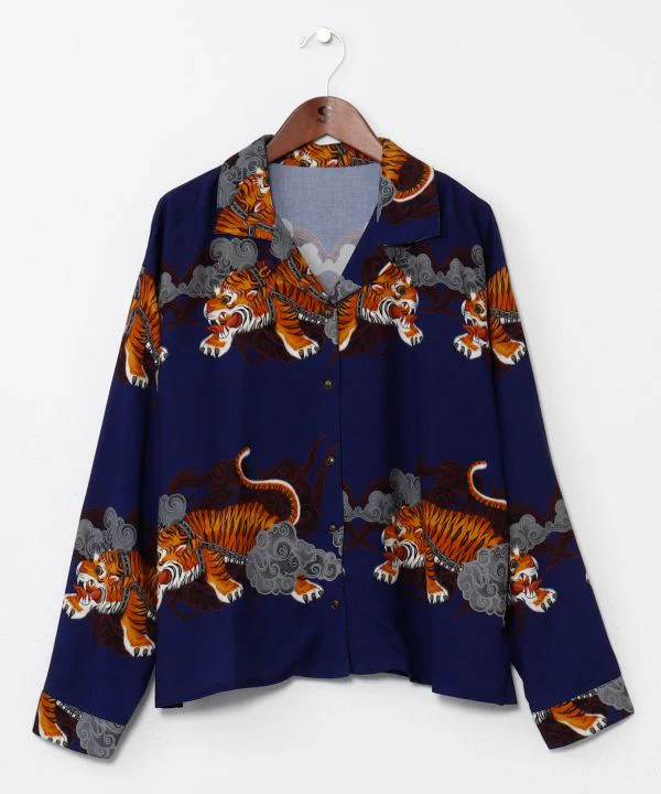 Cette chemise à manches longues présente une bordure ornée d’un motif saisissant, évoquant une peinture tibétaine. Les motifs de bon augure représentant des nuages, des dragons, des tigres et des yaks s’harmonisent parfaitement, et la matière en rayonne offre une douceur incomparable. Dragon : symbole de puissance, divinité protectrice, incarnation du tonnerre, porte-bonheur et de protection contre les exorcismes. Tigre : symbole de courage, de force, de sagesse et de compassion. Yak : animal essentiel à la subsistance du peuple tibétain. Son lait est transformé en beurre, sa viande est consommée, sa laine sert à la confection de vêtements et sa bouse est utilisée comme combustible.