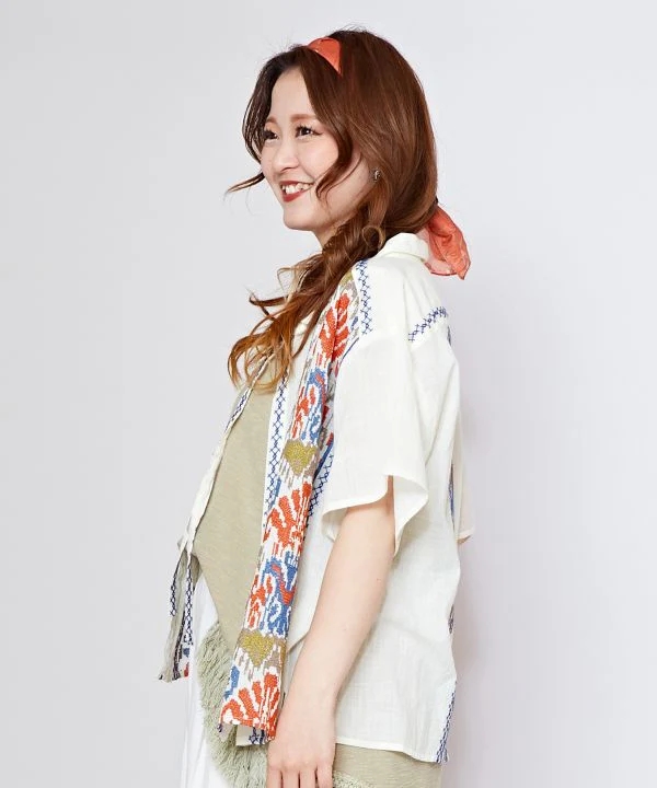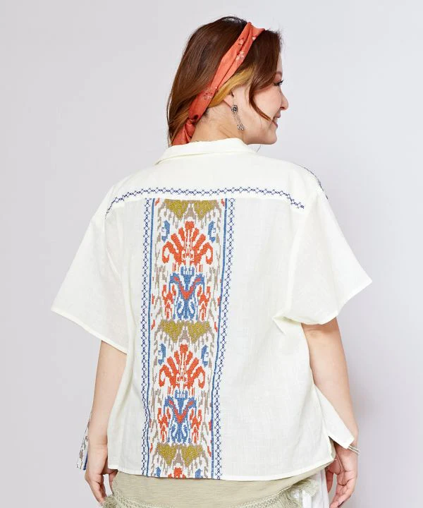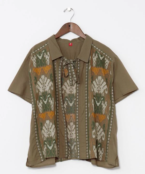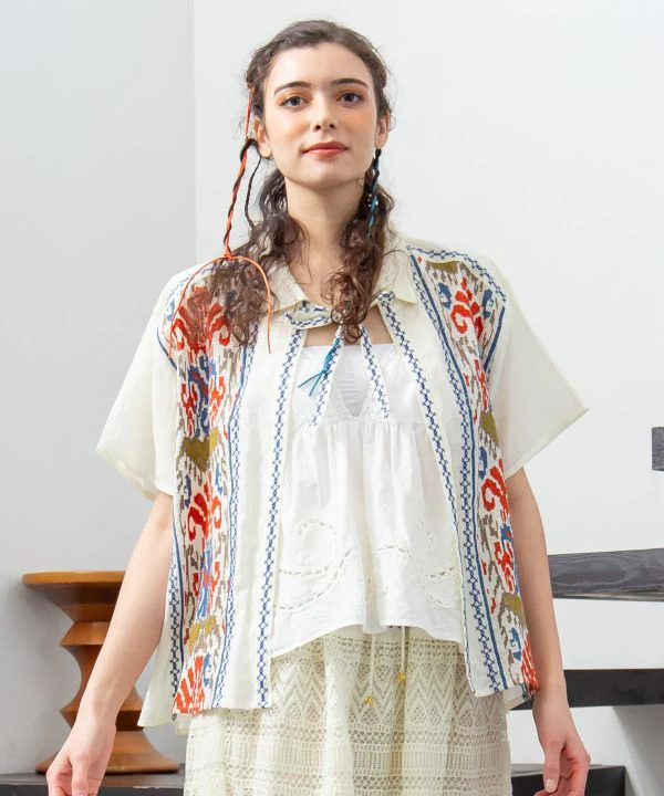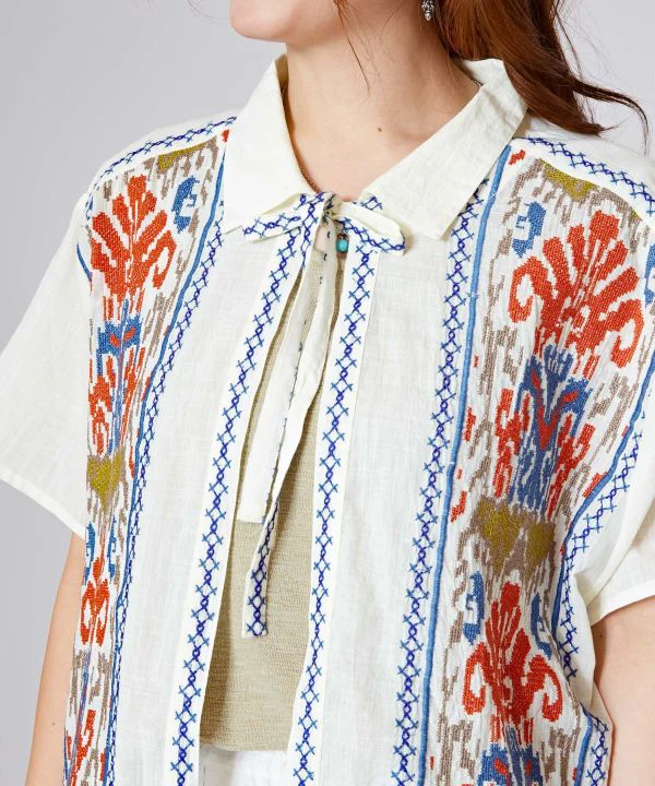 Cette chemise superposée est confectionnée dans un coton légèrement transparent et se porte facilement par-dessus un t-shirt. Le motif ikat, technique traditionnelle ouzbèke, est rehaussé de broderies. Douce au toucher, elle arbore une jolie couleur vintage. Avec ses broderies sur les cordons autour du col et dans le dos, cette pièce deviendra la pièce maîtresse de votre tenue.