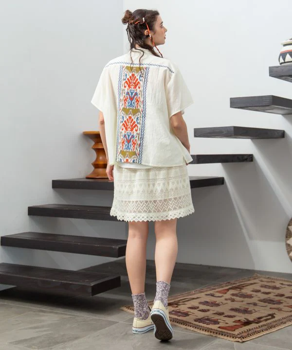Cette chemise superposée est confectionnée dans un coton légèrement transparent et se porte facilement par-dessus un t-shirt. Le motif ikat, technique traditionnelle ouzbèke, est rehaussé de broderies. Douce au toucher, elle arbore une jolie couleur vintage. Avec ses broderies sur les cordons autour du col et dans le dos, cette pièce deviendra la pièce maîtresse […]