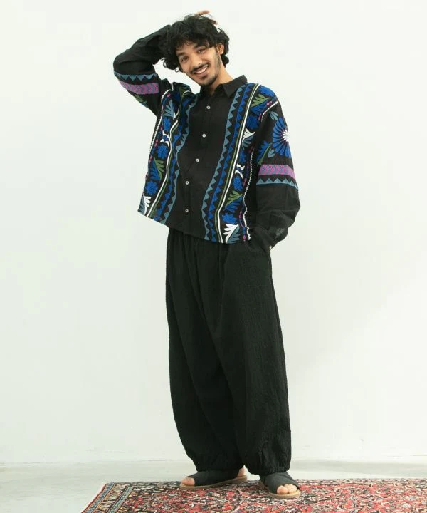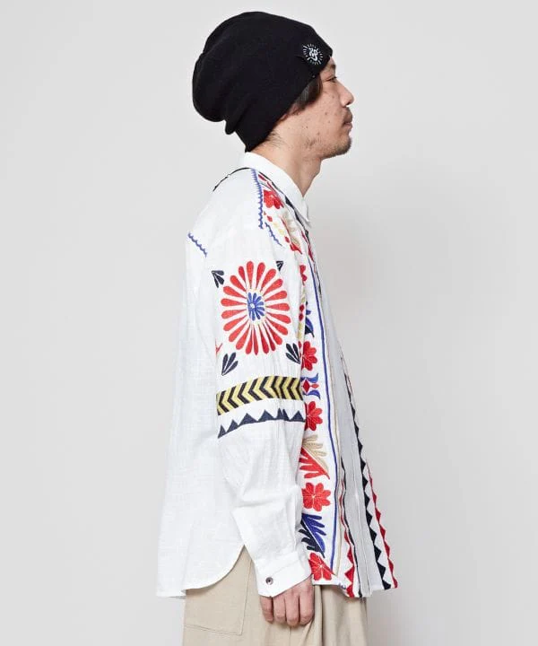 Cette luxueuse chemise pour homme est ornée du motif brodé Suzani de Tachkent, en Ouzbékistan. Suzani est un dérivé du mot persan qui signifie aiguille. Le motif traditionnel en forme de rosace du soleil et de la lune est le motif principal, tandis que des motifs de fleurs et de feuilles, qui ont le sens de la fertilité, sont brodés en abondance. Le tissu est en coton flammé léger avec une texture tendue appropriée.