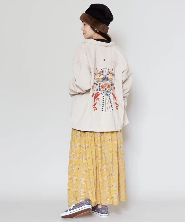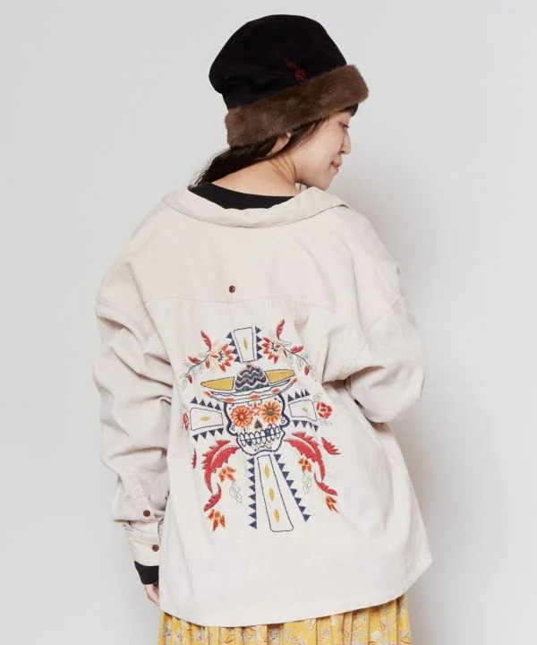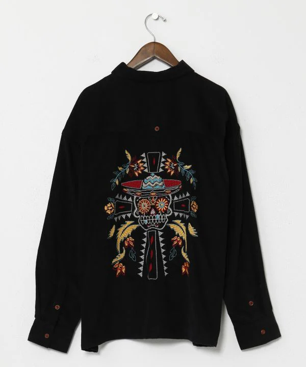 Chemise en velours côtelé doux avec une attention particulière portée aux détails. Le design s’inspire de la guajabera, une chemise portée comme tenue de soirée au Mexique. Le dos est brodé avec audace du motif du Jour des Morts composé de calaveras, de soucis et de croix. Le devant peut être ouvert pour servir de cape.
