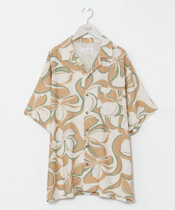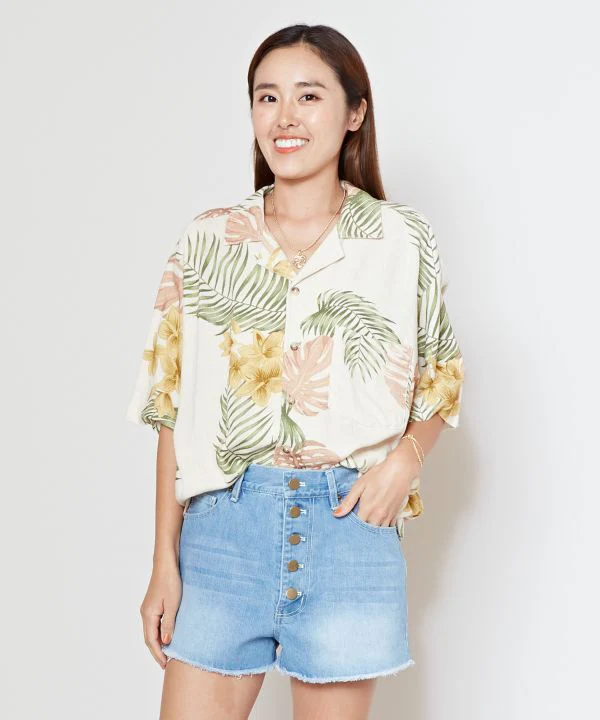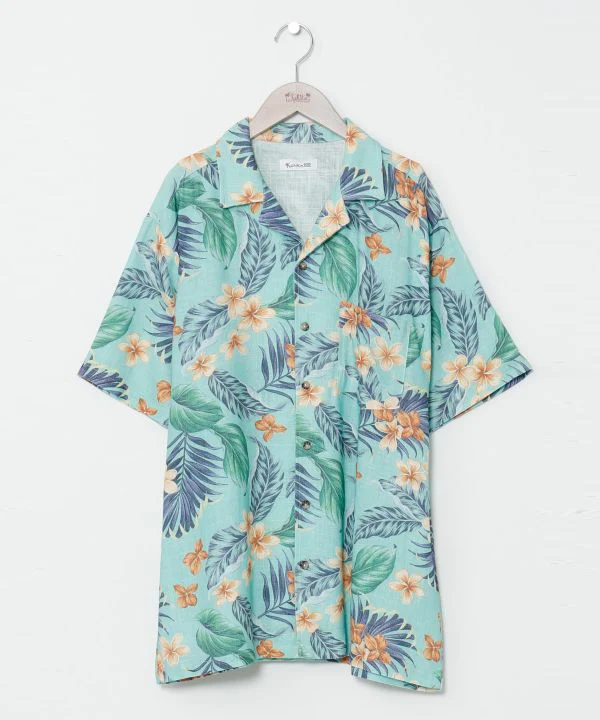 Chemise Aloha en rayonne mélangée de lin qui est confortable même sur la peau en sueur avec un imprimé de style vintage d’un motif botanique représentatif d’HAWAII. Convient pour unisexe.