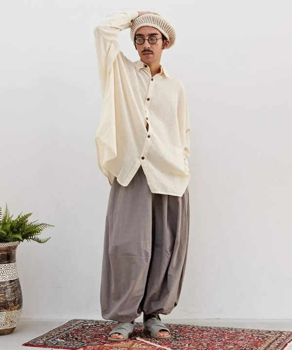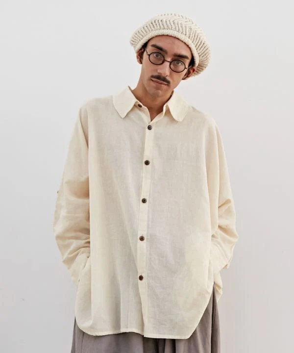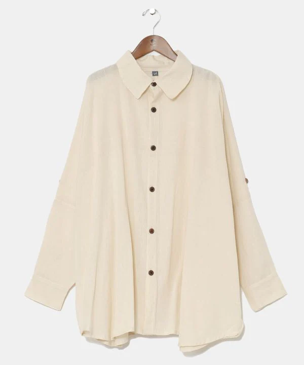 Chemise ample avec la texture du coton népalais qui devient plus confortable au fur et à mesure que vous la portez. La longueur peut être ajustée grâce aux boutons sur les manches. Elle est superbe non seulement comme chemise mais aussi comme veste tissée. Design unisexe. Un article indispensable pour les longues saisons.