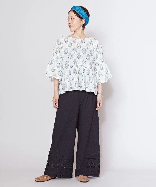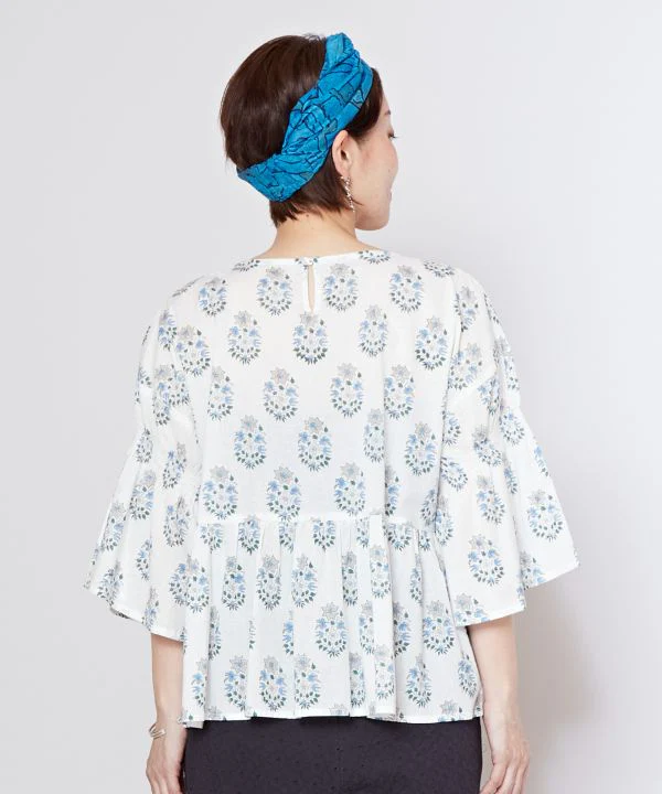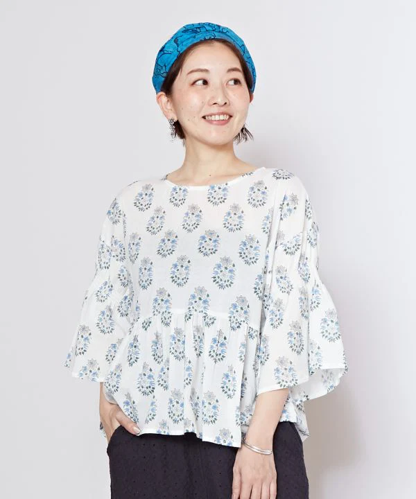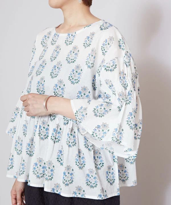 Ce haut tendance à imprimé bloc est confectionné en coton indien léger, dont les motifs varient selon les couleurs. Les coutures froncées sur les manches créent un effet duveteux et complètent parfaitement le look. Les manches longues protègent du soleil.
