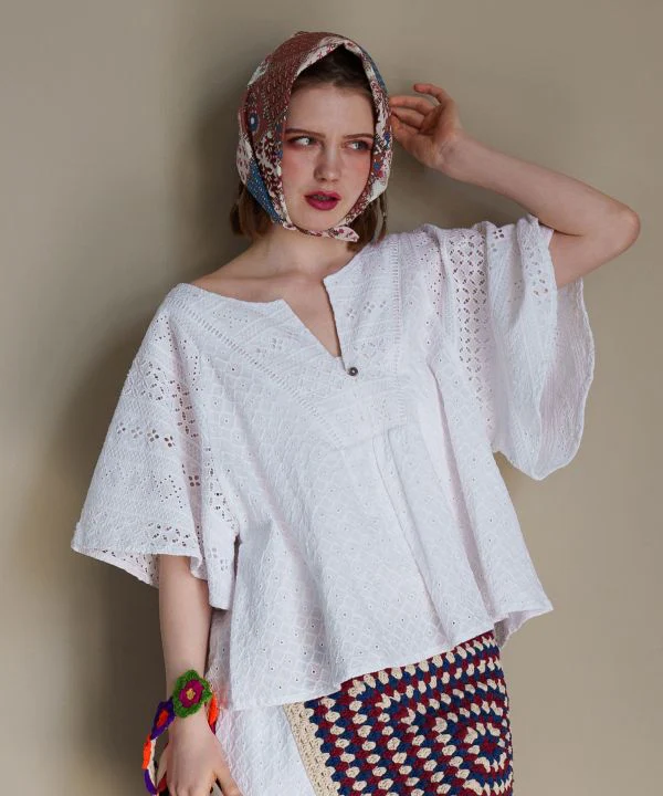 Ce haut associe deux types de broderies schiffli et de dentelle. Sa coupe courte, ses manches volumineuses et son dos nu noué lui confèrent une allure élégante. *Chaque article ici est fabriqué à la main par des artisans un par un. Par conséquent, la forme et la couleur peuvent varier légèrement. Veuillez comprendre cela à […]