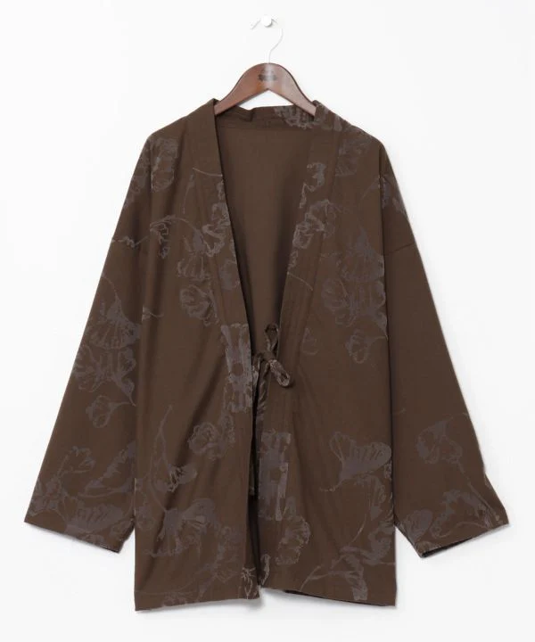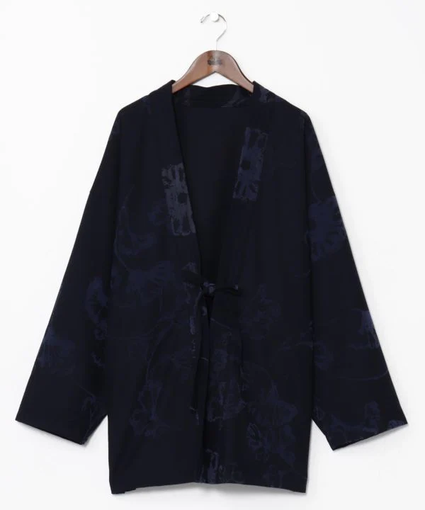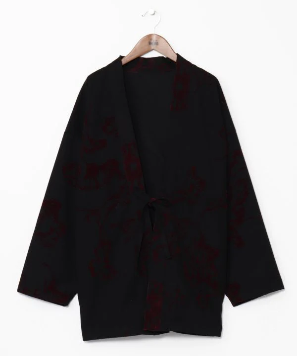 Haori court au motif de feuilles floues. Son tissu chaud et légèrement brossé lui confère une allure luxueuse et raffinée. Sa coupe ample convient aussi bien aux hommes qu’aux femmes. Poches latérales.