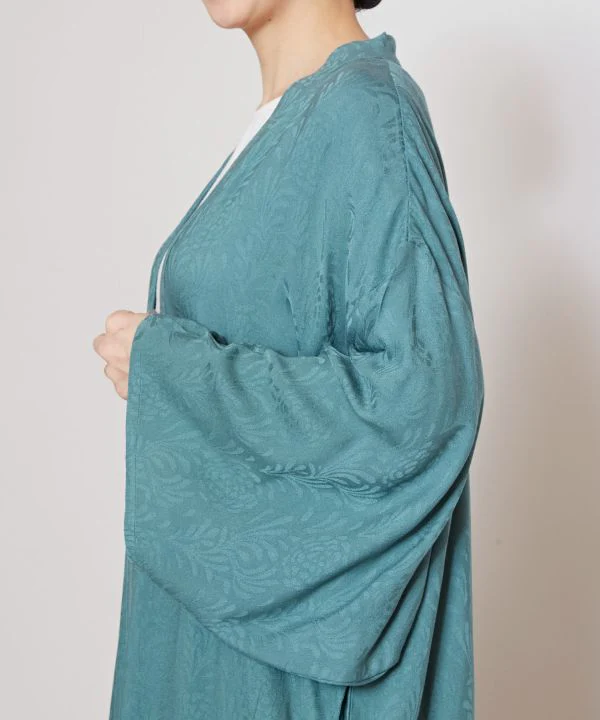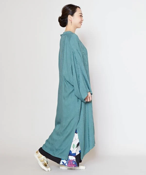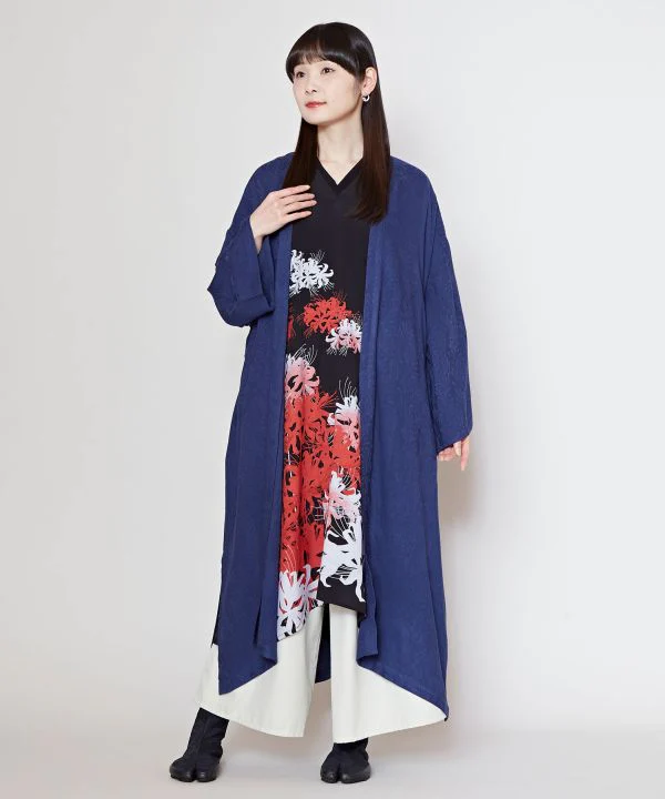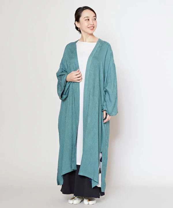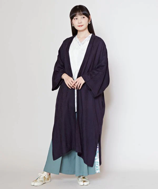 Haori anti-UV en rayonne agréable au toucher. Sa coupe longue, rappelant celle d’un kimono, vous permettra de profiter pleinement de l’atmosphère d’un kimono japonais. Son tissage jacquard orné de chrysanthèmes flottants lui confère une allure élégante. Avec poches latérales.
