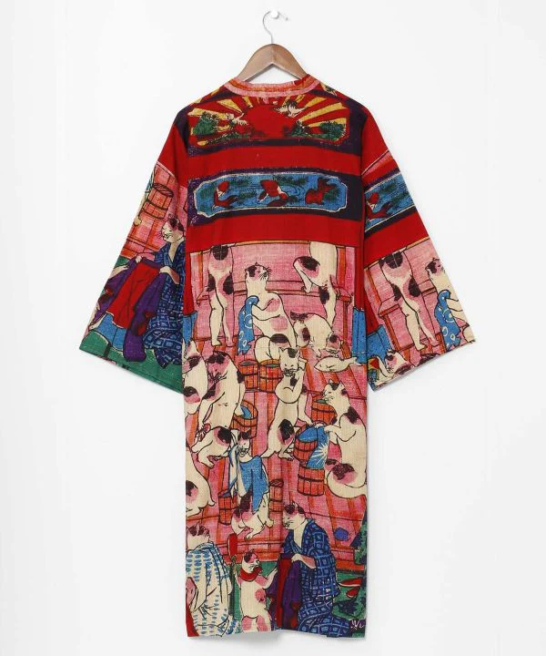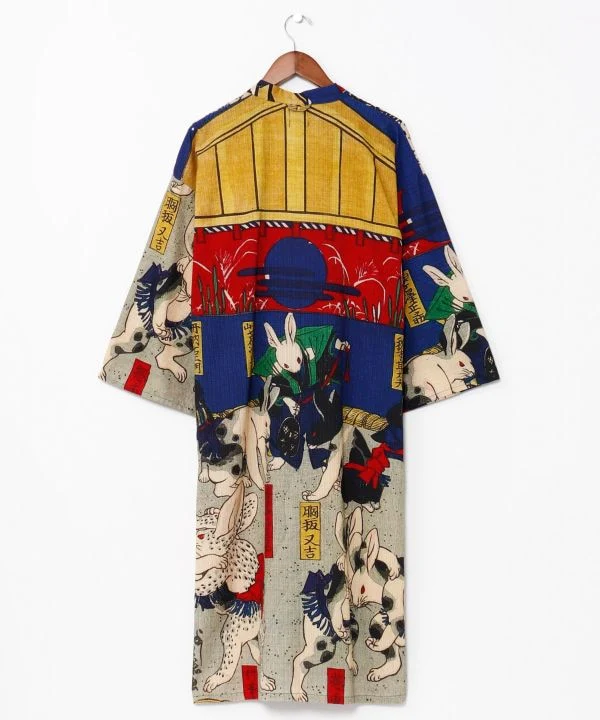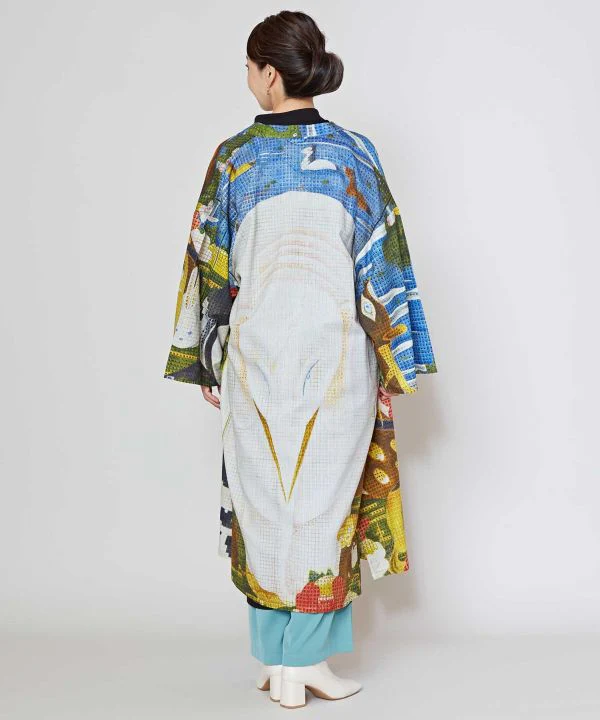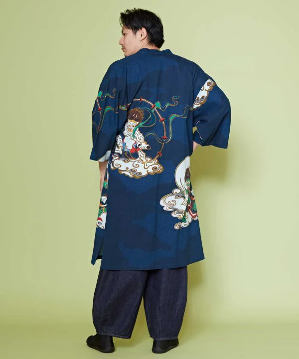 Un haori NIPPON ART à porter. Un haori façon kimono au motif chic revisité à partir d’imprimés ukiyo-e. Son tissu en coton dobby expressif lui confère une coupe ample. Cette pièce allie l’élégance d’un motif audacieux à la facilité de port. Une grande variété de motifs est disponible, notamment des têtes de mort, des chats, des phénix et des lapins. Modèle unisexe. Avec deux poches latérales.
