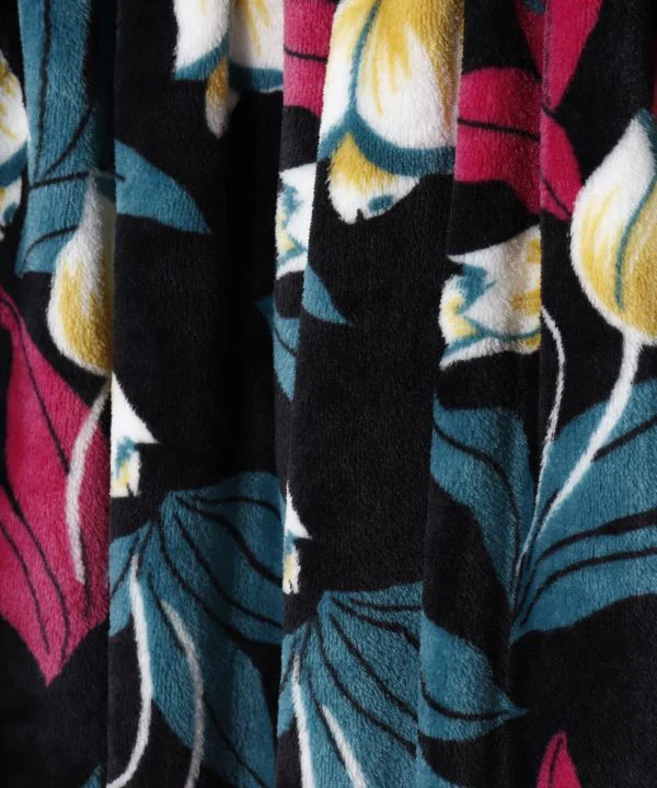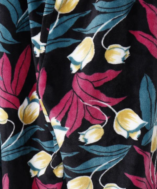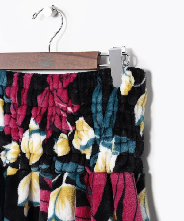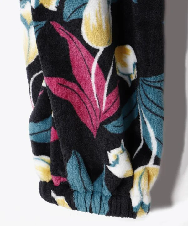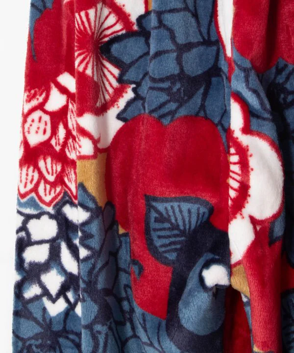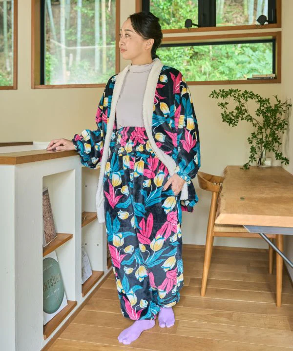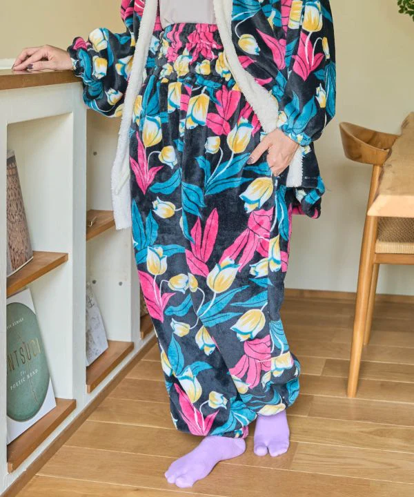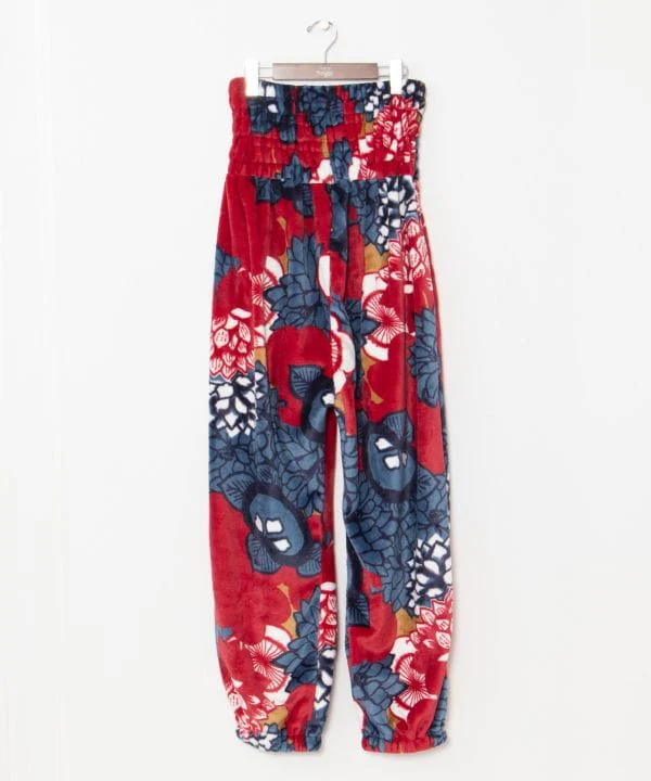 Pantalon Monpe chaud en matière boa, orné de motifs floraux japonais et ukiyo-e. Sa taille élastique épouse parfaitement le ventre et garde les fesses au chaud. Poches latérales. À offrir ou à s’offrir.