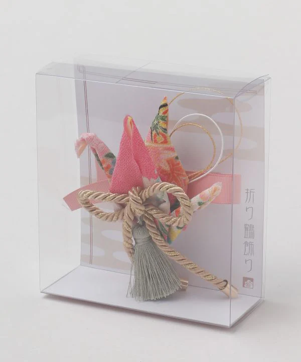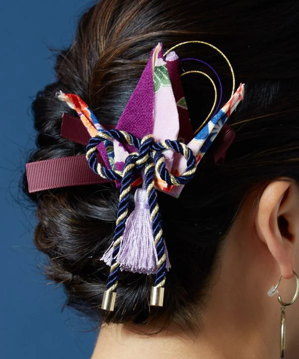 Un ornement pour cheveux composé d’une grue en papier pliée en chirimen, de mizuhiki et de ficelles nouées. Sa pince permet de le porter dans toutes les positions. Un accessoire idéal pour les journées spéciales « Hare no Hi ».