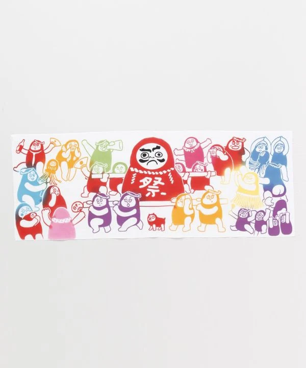Une serviette à main avec d’impressionnantes poupées Daruma aux expressions uniques. Aujourd’hui est un jour de festival pour les poupées Daruma dans une ville. Tout le monde fête joyeusement.