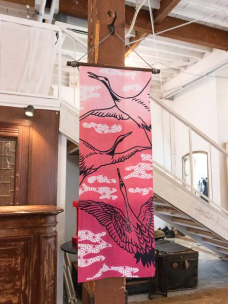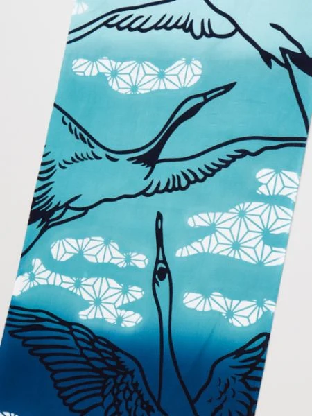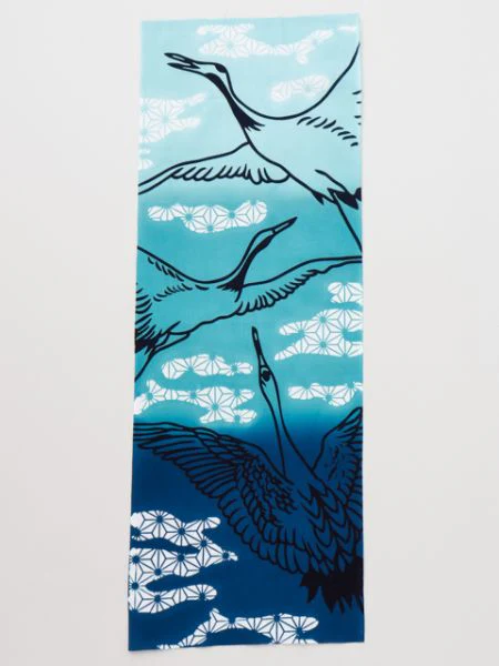 Une serviette Tenugui représentant une grue, considérée comme un symbole de longévité, dans le motif traditionnel « Asanoha ». La grue volant haut dans le ciel est une pièce parfaite lorsqu’elle est affichée.