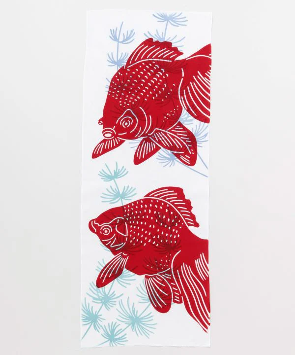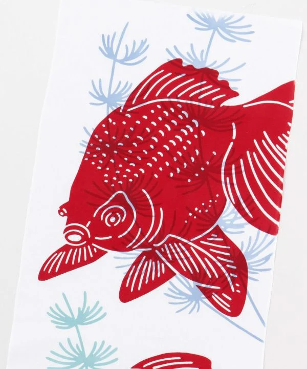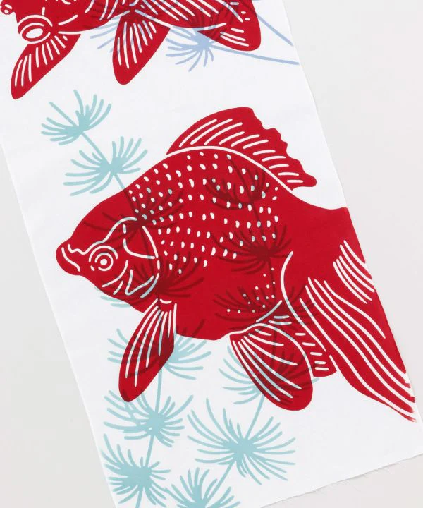 Une serviette de toilette ornée d’un poisson rouge nageant gracieusement dans l’eau. Le poisson est teint deux fois selon la même technique, ce qui lui confère un effet tridimensionnel. Les algues visibles à travers le tissu sont très originales. Cette pièce est une réinterprétation de « Poisson rouge » par Kohara Koson.