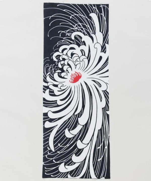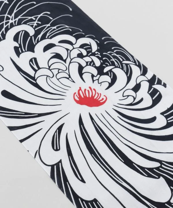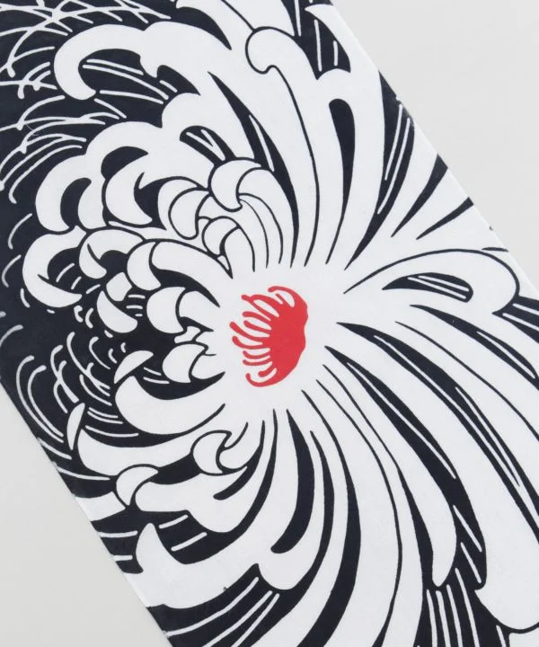 Cette serviette tenuegui présente une composition audacieuse de chrysanthèmes en pleine floraison. Le contraste entre le noir et le blanc et la couleur rouge lui confère un design moderne et affirmé. Cette pièce peut être appréciée aussi bien pour la décoration que pour son usage quotidien et est idéale pour créer un espace empreint d’esthétique japonaise.