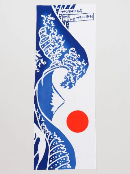 Serviette Tenugui de style Ukiyoe redessinée à partir du « Kanagawa-okihaura » de Katsushika Hokusai. Les vagues tourbillonnantes sont impressionnantes.