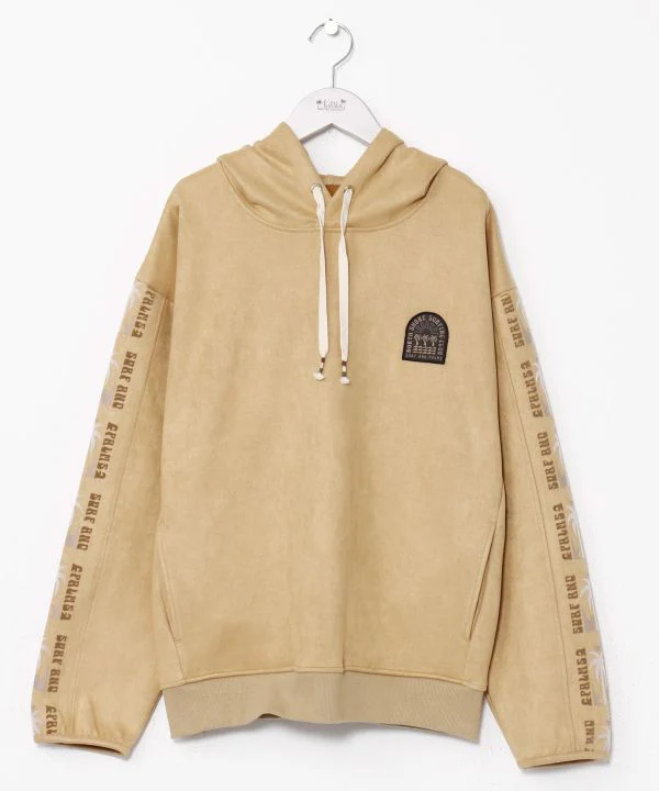 Ce sweat à capuche est confectionné en imitation daim doux au toucher. Ce modèle au style surf arbore des imprimés palmiers sur les manches. Doté de poches avant, il est confortable à porter. Modèle unisexe.