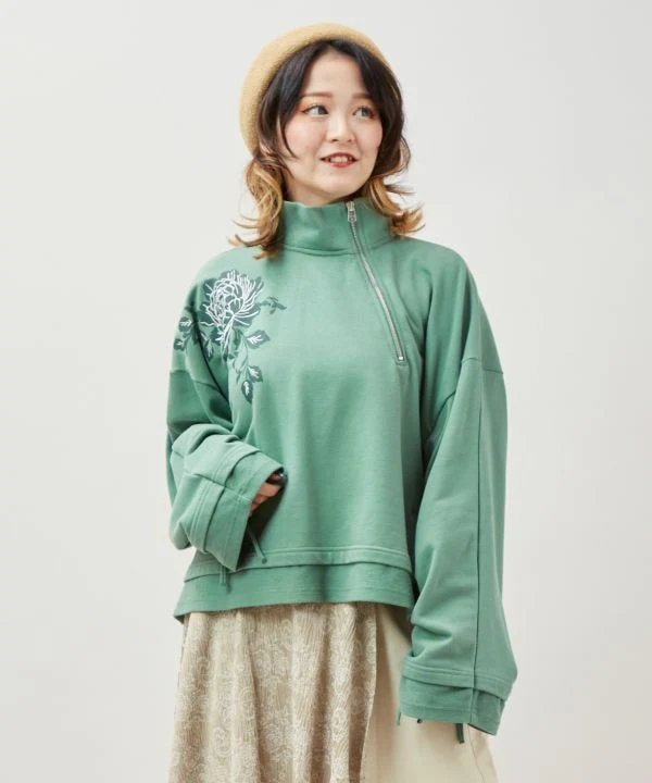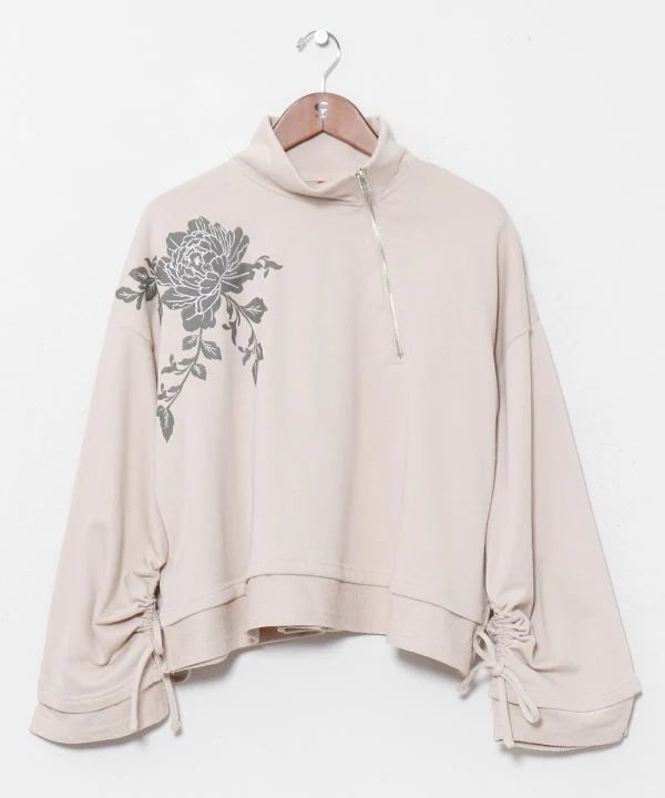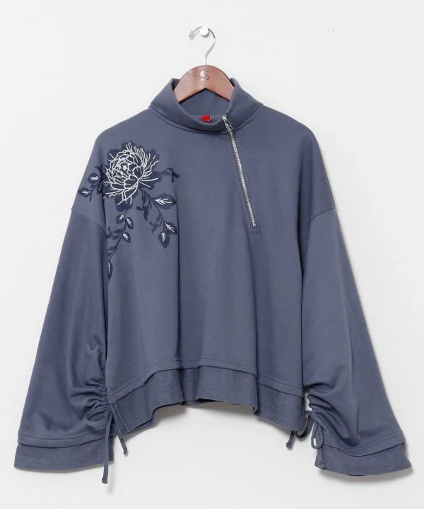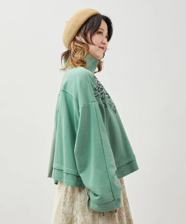 Un haut unique, incarnant l’essence même de la « chinoiserie », où la beauté orientale rencontre la sensibilité occidentale. L’imprimé pivoine et les broderies argentées attirent le regard, tandis que les empiècements contrastés jouent sur la texture du tissu polaire pour créer un effet de superposition. Le cordon de serrage aux poignets permet d’ajuster la silhouette.