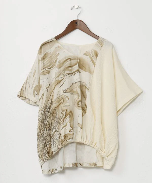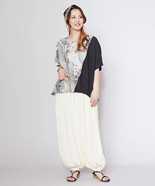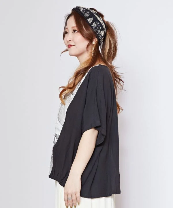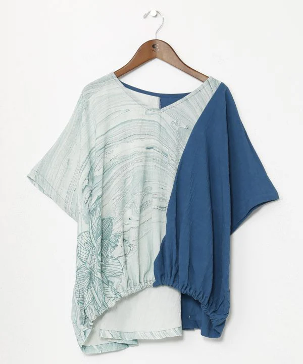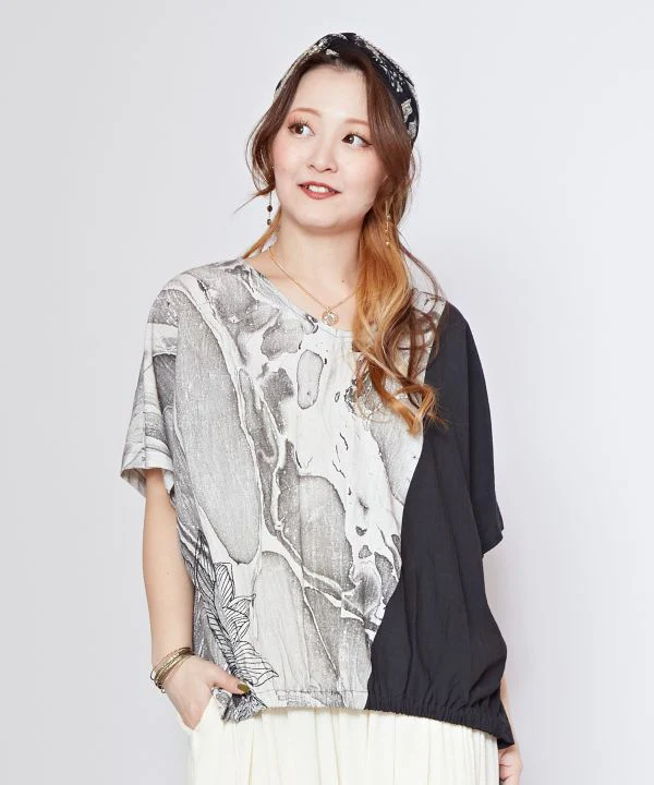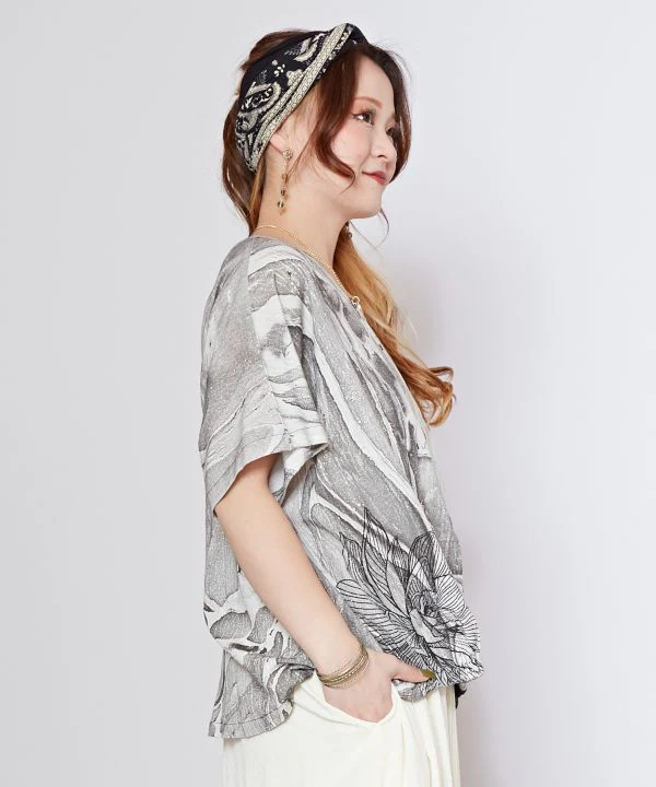 Haut asymétrique représentant un lotus. Le devant est doté d’un élastique à la taille pour un look coordonné. Le lotus est un symbole de pureté, car il évoque de magnifiques fleurs émergeant d’une eau boueuse. En intégrant le lotus à votre ensemble, à la fois comme accessoire de mode et porte-bonheur, vous ressentirez le message qu’il contient au plus profond de votre cœur.
