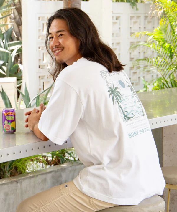 T-shirt homme au fini délavé pour un toucher doux. Le dos présente un imprimé audacieux représentant un paysage hawaïen baigné de soleil. Broderie « Surf pa ms » sur la poitrine. Sa matière épaisse et légèrement brossée en fait un t-shirt idéal en toute saison.