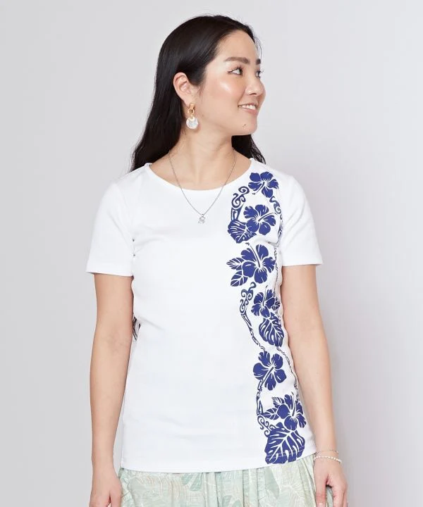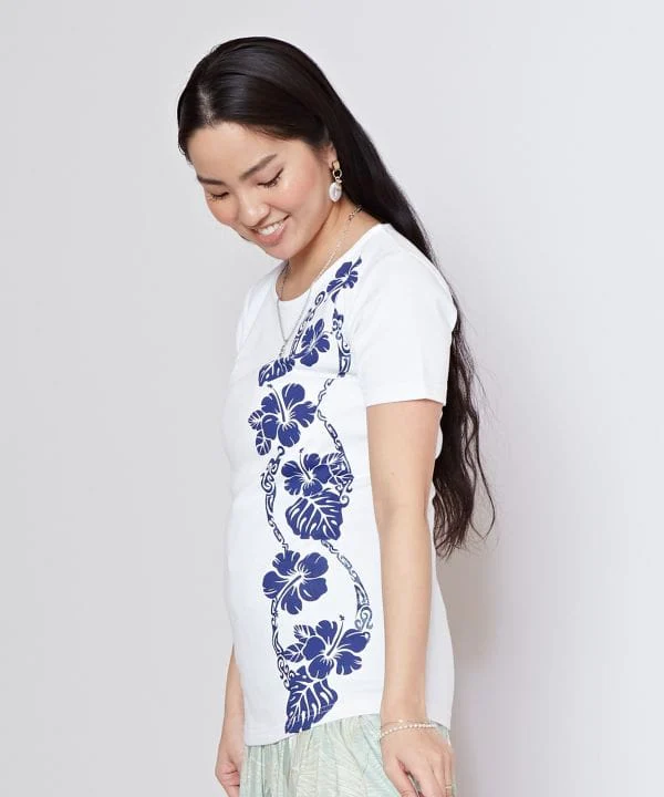 T-shirt hula avec un mélange de motifs tribaux et d’hibiscus. Confortable et suffisamment long pour être porté pendant les cours de hula.