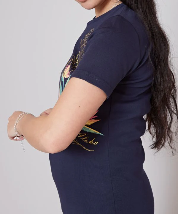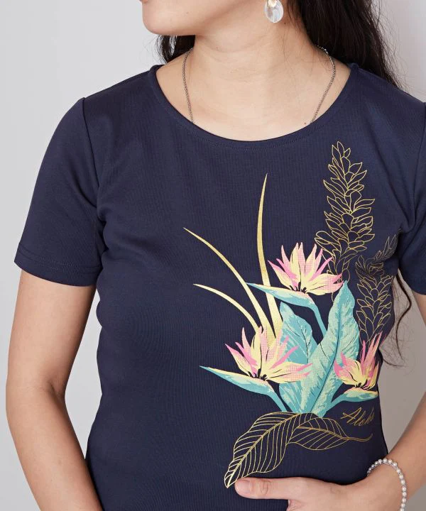 T-shirt Hula avec un magnifique motif de bouquet de fleurs hawaïennes. Confortable et suffisamment long pour être porté pendant les cours de hula.