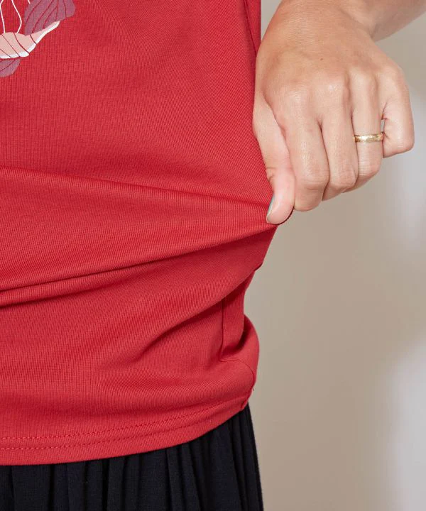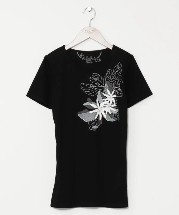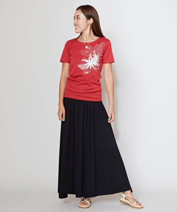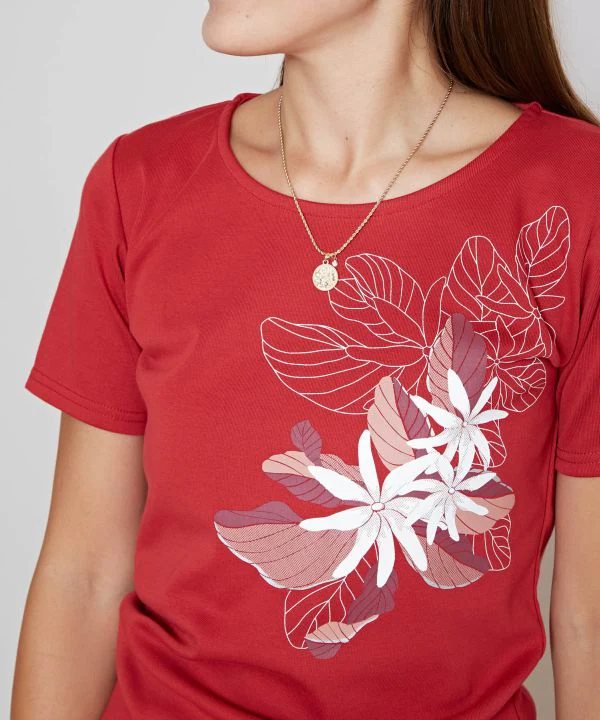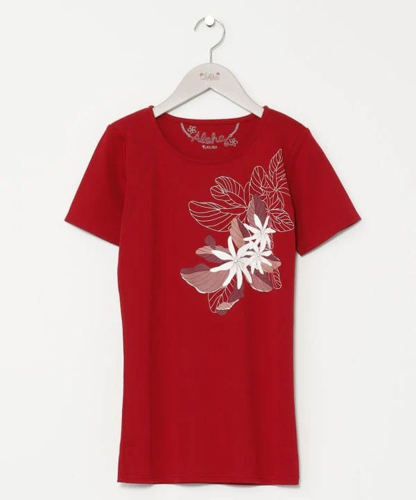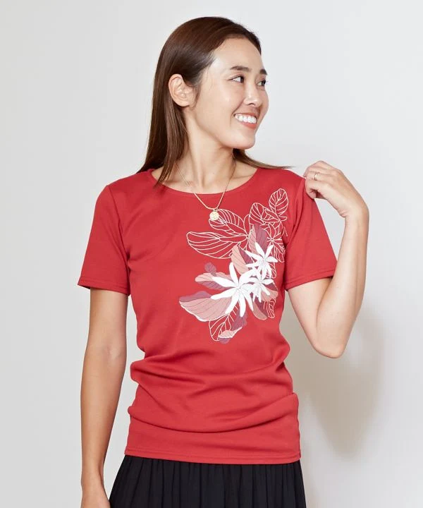 Ce T-shirt de cours de hula arbore la fleur de tiaré et les feuilles qui symbolisent Tahiti. Le coton doux pour la peau est extensible et ne colle pas au corps, ce qui le rend adapté à un usage quotidien. Les nuances chics de rouge et de noir accentuent le look mature.