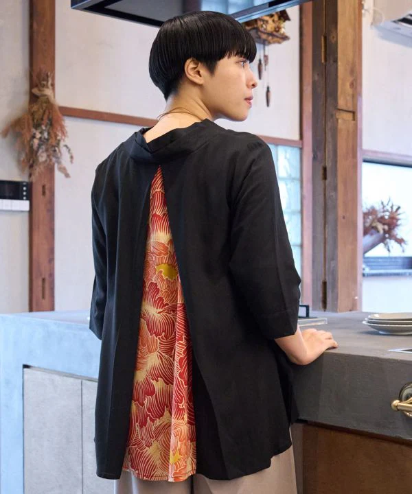 Ce haut est fait de rayonne avec une sensation de légèreté qui vous garde au frais même en été. La fente sur le côté vous permet de porter votre pantalon devant et de le porter avec style. Le magnifique motif de couleur est inspiré du « Hakkake », une caractéristique de mode cachée du kimono, […]