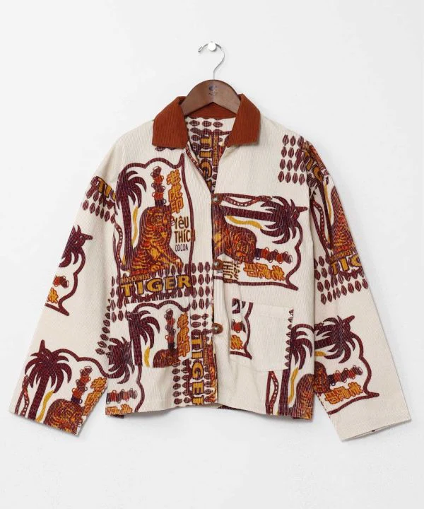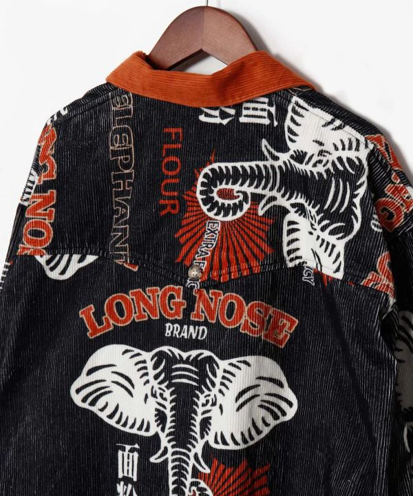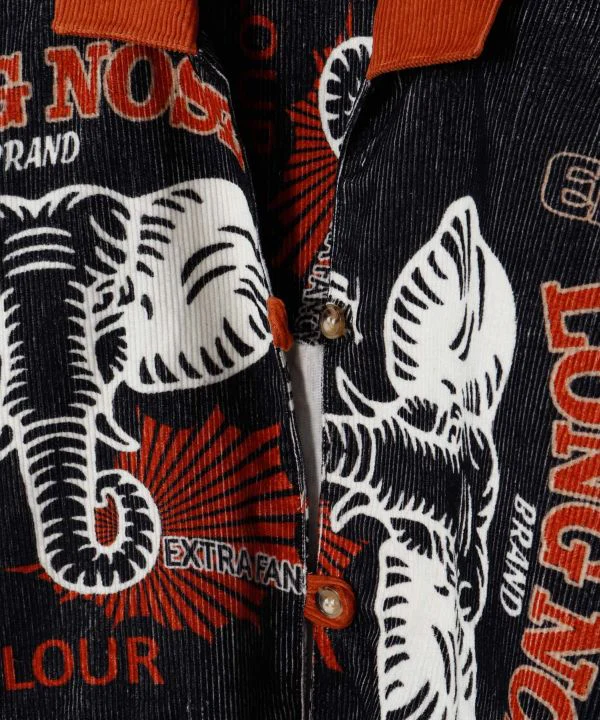Cette chemise est confectionnée dans un velours côtelé épais et chaud, qui peut également servir de veste. Son motif textile rétro-oriental, inspiré des thèmes de la civilisation et des Lumières, entremêle les cultures étrangères et japonaises dans cette pièce attrayante.